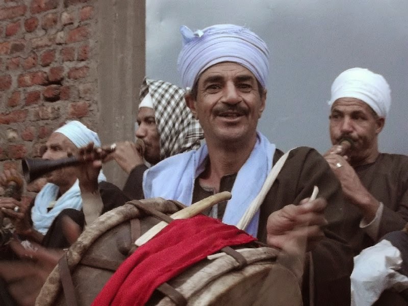 They are accompanied by a five piece band, very tight, with four blowing squeaky pipes (mizmar) and a drummer with a very two-sided drum (zamarr) with high and bass notes. The lead mizmar has a mike and its sound is amplified into a shrill piercing sound. At one stage, amidst the musical cacophony I seem to recognize a tune. What is it? Ohcorblimey, it's Happy Birthday to You! I make eye contact with the blokey shown above with the white bandage on his head: he's playing it for me and he somehow grins with his eyes. What a laugh. But I am also deeply honoured.
